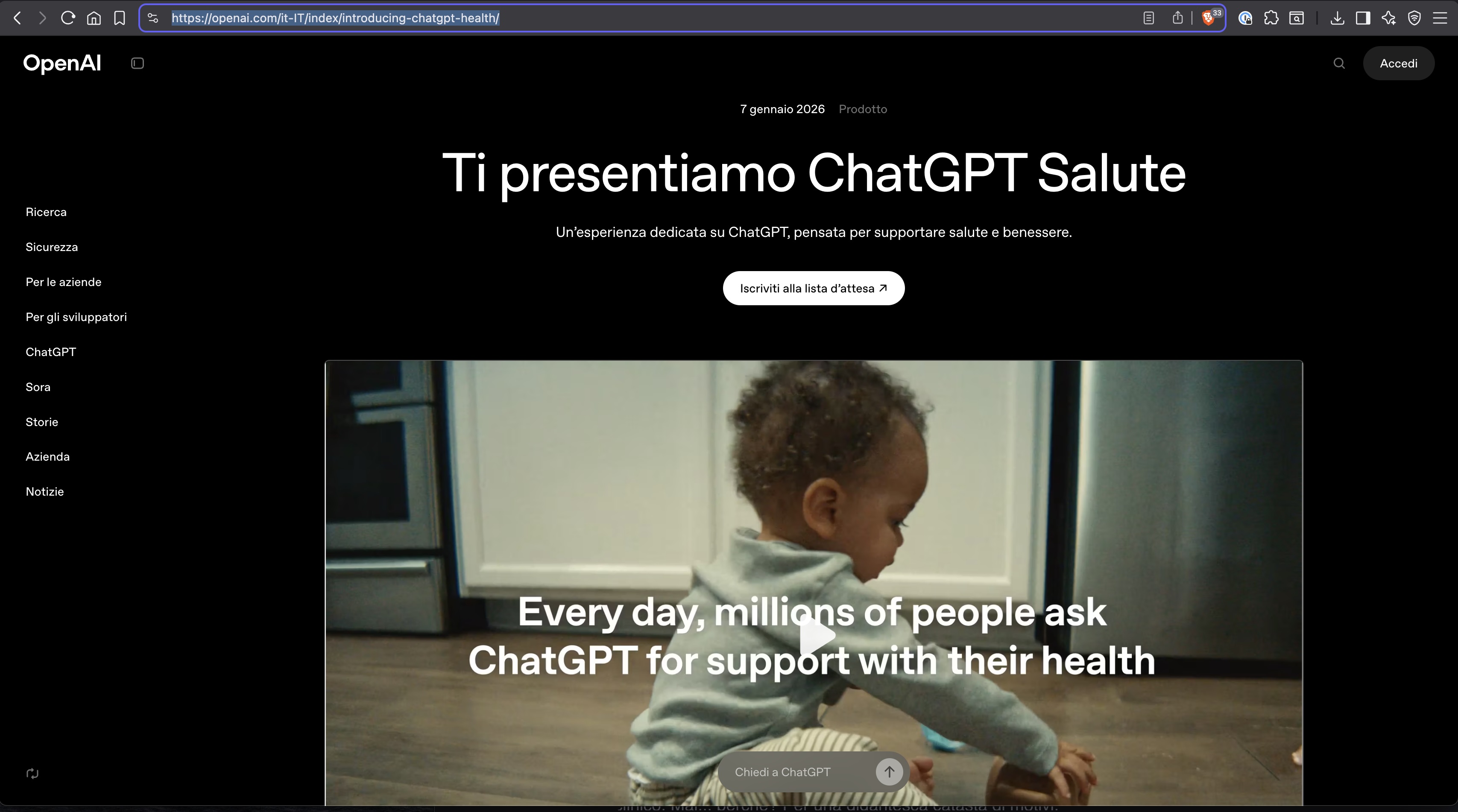 Stiamo introducendo ChatGPT Salute, un’esperienza dedicata che integra in modo sicuro le informazioni sanitarie con l’intelligenza di ChatGPT, per aiutare a sentirsi più informati, preparati e sicuri nella gestione della propria salute.