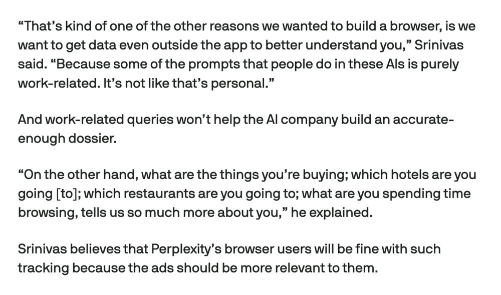 2) Il CEO di Perplexity ha affermato che il browser web dell'azienda è progettato per tracciare gli utenti sul web, per creare profili dettagliati e vendere annunci iper-personalizzati. Il browser monitora le abitudini di navigazione, le attività di acquisto, gli interessi di viaggio e ristorazione, il tempo trascorso sui siti, ecc. Il fenomeno ha espresso la convinzione che gli utenti accetteranno questo livello di tracciamento in cambio di annunci pubblicitari più pertinenti.