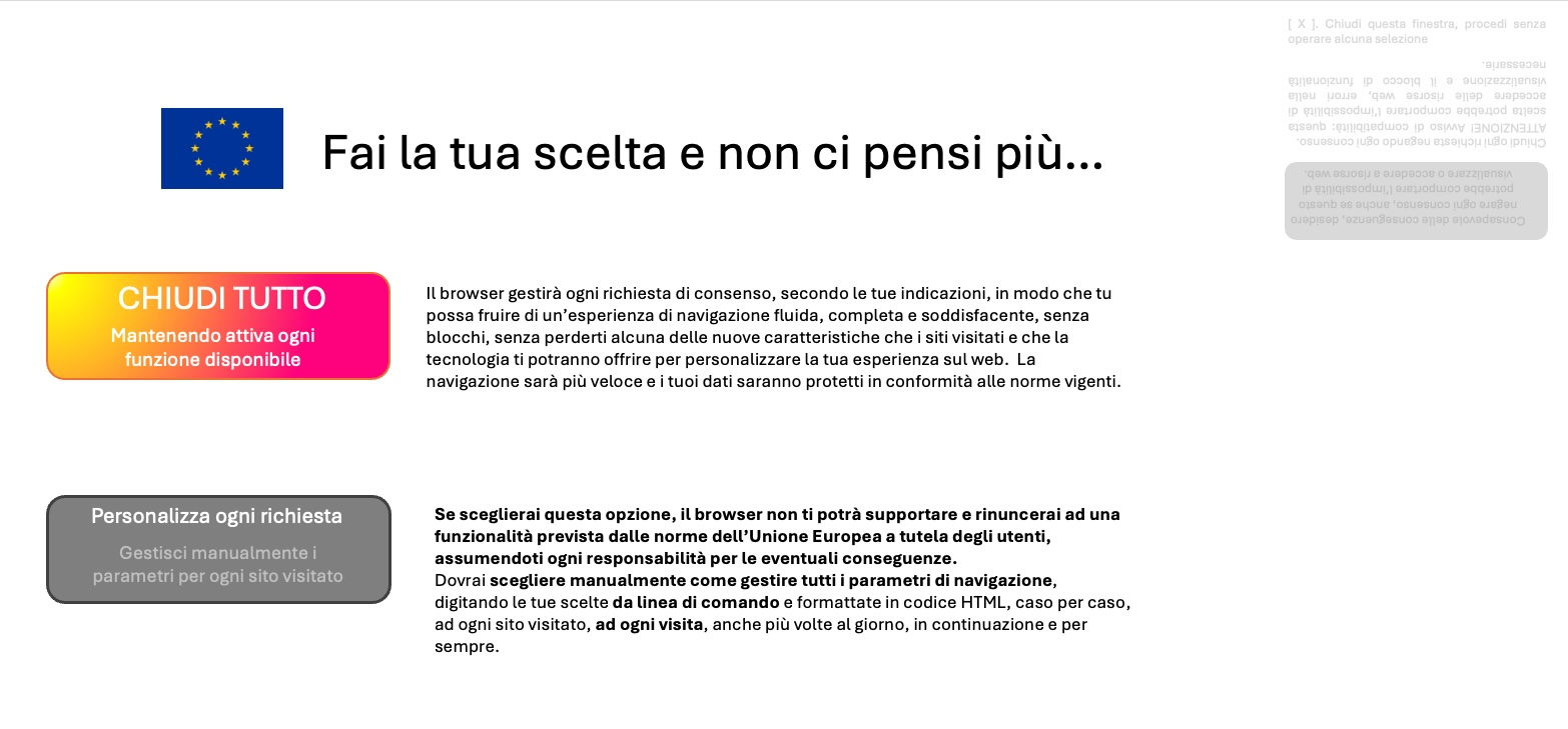 i browser, sviluppati proprio dalle aziende che hanno più interesse nell'acquisire consensi superflui come google, microsoft, quelli in-app, vale a dire quelli interni a X, facebook, linkedin, instagram, ecc, (che permettono di visualizzare i link senza uscire dall'applicazione,) saranno dotati di comode e oneste finestre di selezione per impostare le preferenze globali e, una volta selezionate, saranno per sempre dimenticate, sepolte nelle impostazioni più nidificate.