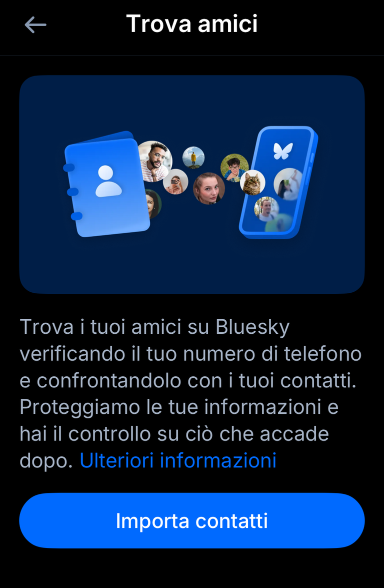Bluesky dovrebbe anche spiegare perché ritiene di dover ricevere i dati dei miei contatti e perché mi sta chiedendo di farlo. A me pare che non sia affatto necessario.