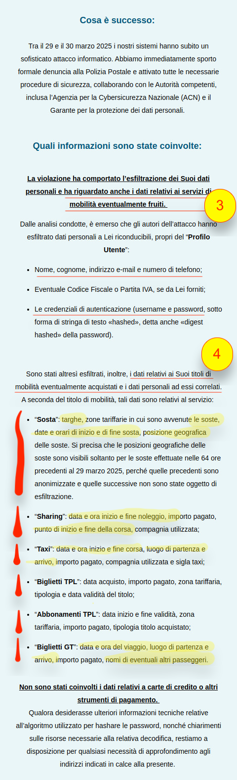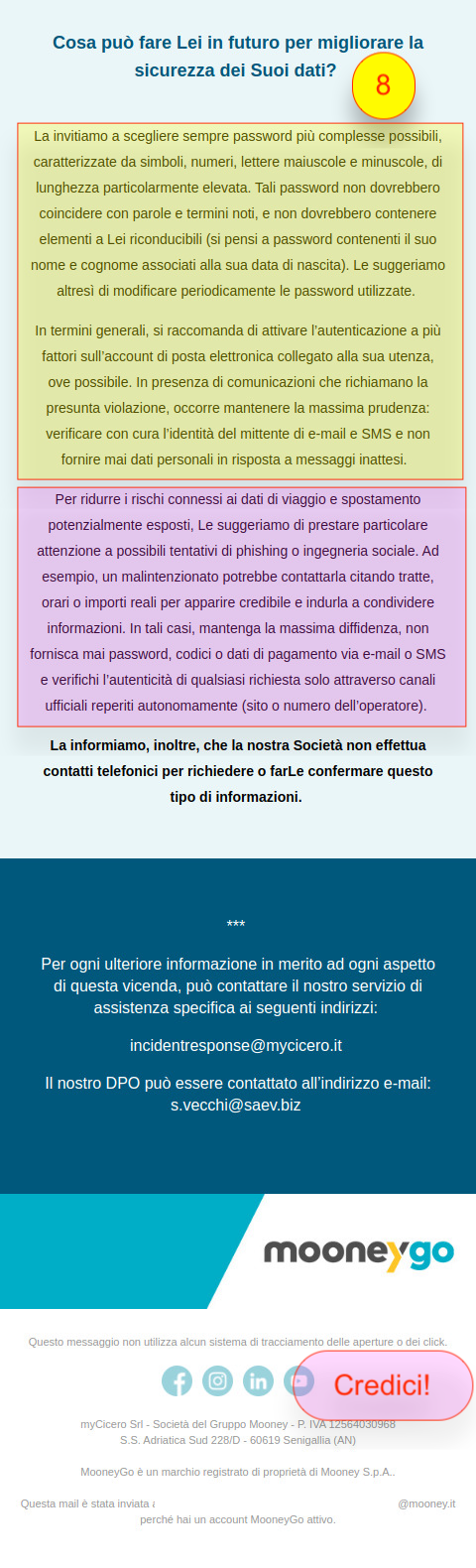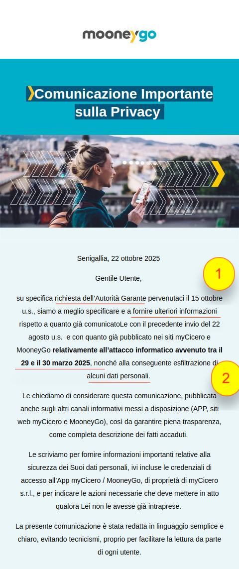 "Noi di MooneyGo ci siamo fatti fregare informazioni riservate sui tuoi viaggi, tragitti, parcheggi, noleggi, luoghi frequentati, spostamenti e abitudini di vita. Per questa ragione ora sei esposto a truffe della peggior specie: truffatori professionisti, sapendo molte cose su di te, avranno la possibilità di apparire credibili e convincenti e non sarai in grado di distinguere una truffa di questo tipo da una chiamata o da un messaggio legittimo. Potresti già aver subito truffe di questo tipo perché i dati sono stati rubati 7 mesi fa, ti avvisiamo solo ora ma solo perché siamo stati obbligati a farlo. Ci scusiamo di questo, non era nostra intenzione turbarti. Da ora in poi non potrai più rispondere a telefonate di operatori, call-center, non potrai più aprire email dai tuoi provider e vivrai come se fossi in costante pericolo. Non potendo più fidarti delle comunicazioni che arriveranno da noi, dagli store online che utilizzi, dalla tua banca, dalla clinica dove ti curi, dalla tua azienda, dalla scuola dei tuoi figli, dalla palestra e da ogni altro tuo fornitore, perderai anche comunicazioni importanti e potresti avere disservizi per mancati pagamenti o simili, ma è inevitabile perché non hai alcuna difesa rispetto a truffe basate sulle informazioni reali che ci siamo lasciati rubare. Grazie per aver usato MooneyGo."