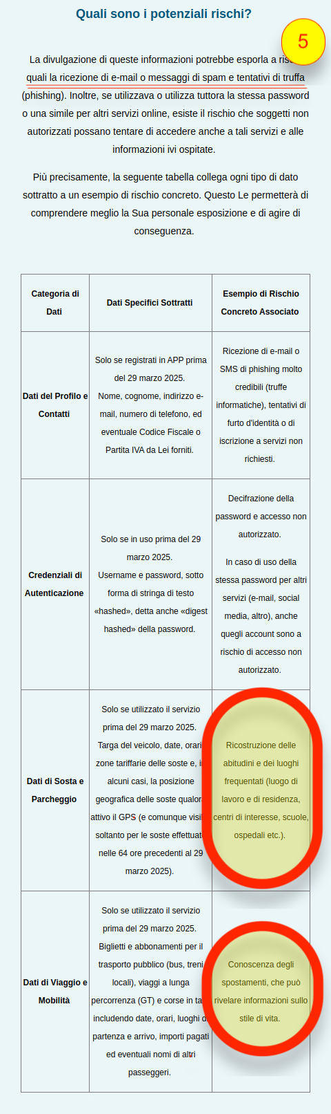 4) tutto. qui c'è dentro tutto, una miniera di informazioni su ogni utente: dove vive, dove lavora, a che ora inizia a lavorare e a che ora finisce, dove e quando va dalla morosa, quando e dove è andato in ferie, cosa ha fatto nel weekend... i suoi spostamenti privati o lavorativi. Nel caso dei biglietti per spostamenti di lunga percorrenza, sono stati compromessi persino i nominativi dei compagni di viaggio. A questo punto, chissene del resto. Questi sono i dati che dovrebbero preoccupare chiunque.