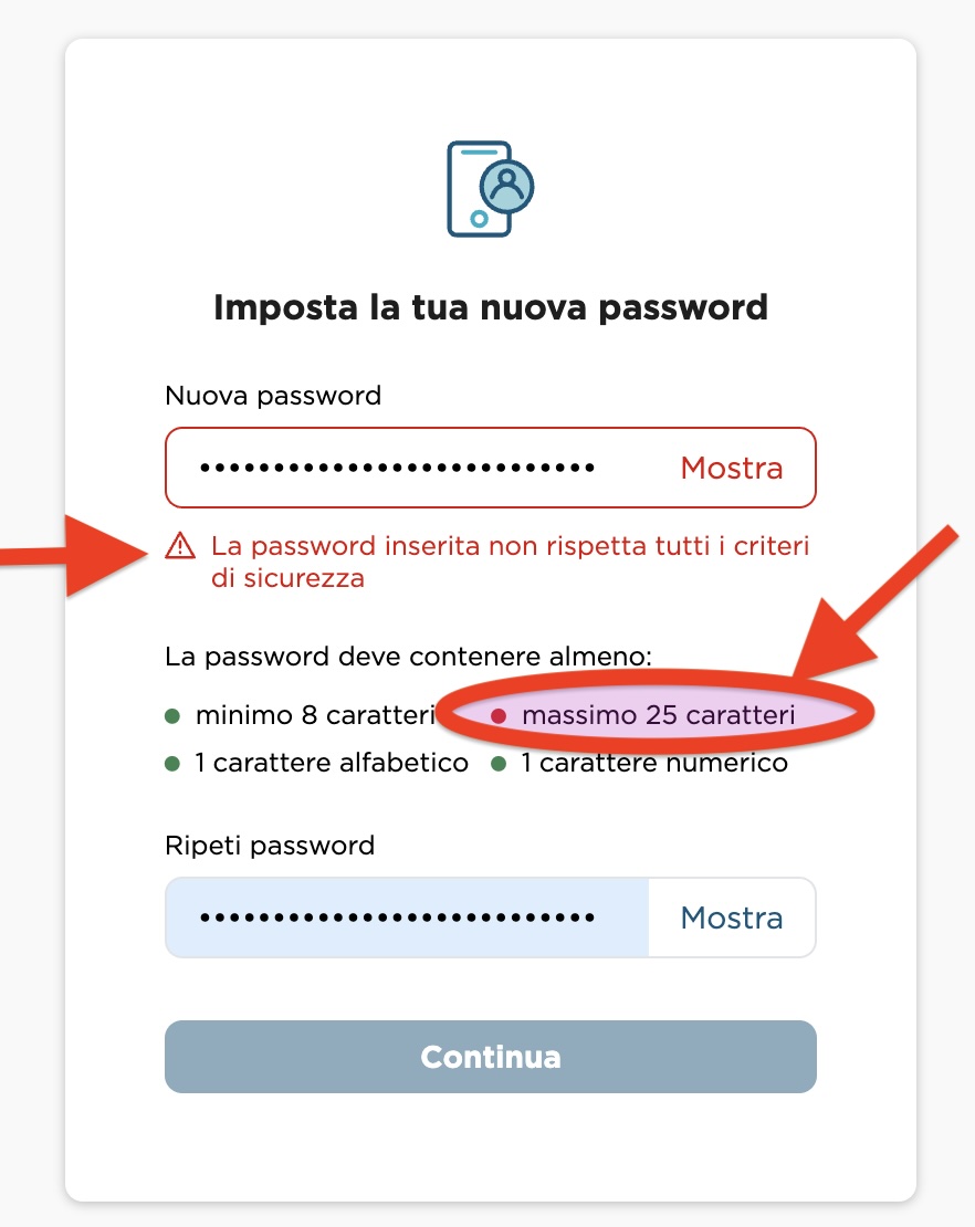 La mia password non rispetta i requisiti di sicurezza, perché? Perché è troppo lunga. Ma certo, logico. Questa colossale idiozia non si concilia con il consiglio appena ricevuto e il suggerimento di comporre password di "lunghezza particolarmente elevata". Peccato. Il sito, per ragioni di sicurezza, non accetta password più lunghe di 25 caratteri e questo, per me, è un cupo mistero ...e spero che resti tale perché le possibili spiegazioni mi terrorizzano.