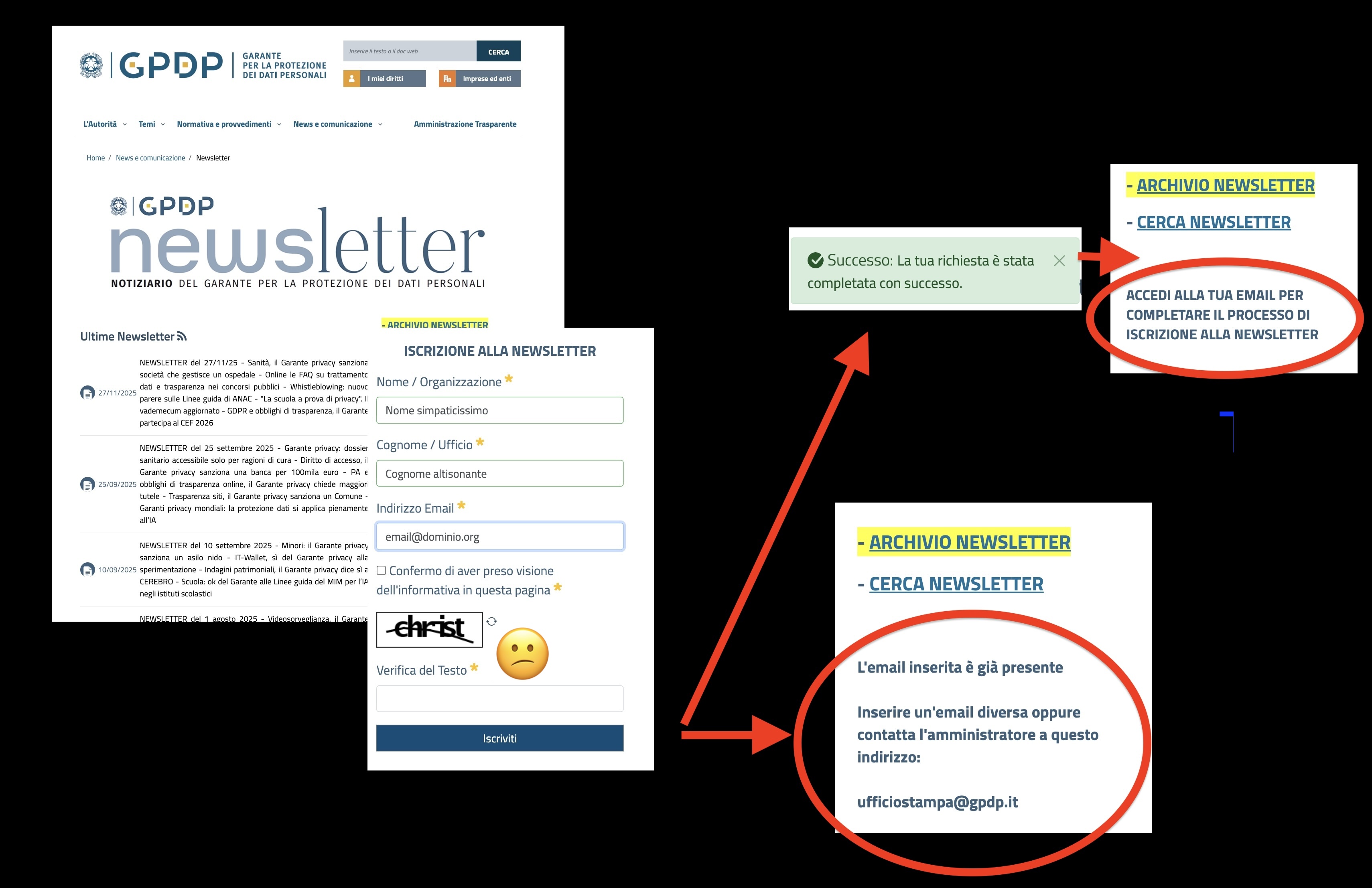 Un'autorità Garante, per esempio, dovrebbe voler evitare una data breach: il fatto che chiunque possa verificare se un certo indirizzo è iscritto o meno a quella lista di distribuzione delle newsletter.