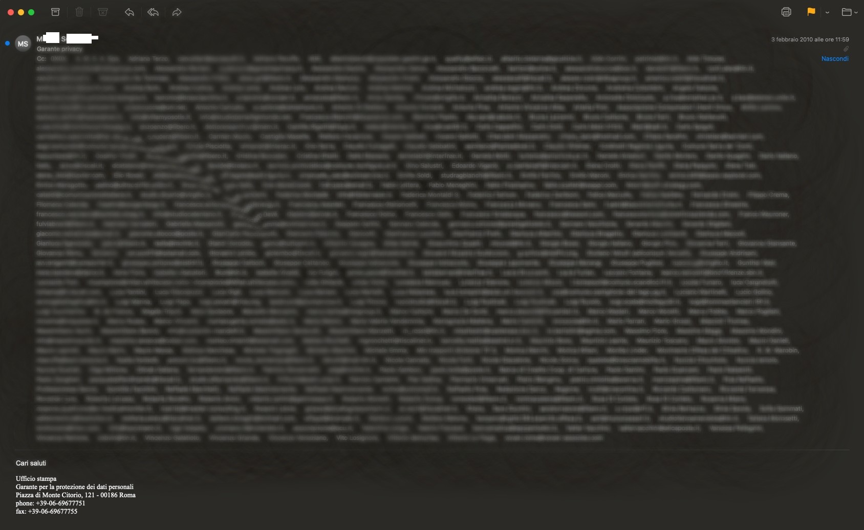 La Newsletter 333 del 10/01/2010, inviata via e-mail a tutti gli iscritti alla newsletter, conteneva un file denominato "newsletter 344.pdf" (bizzarro, ma lasciamo perdere) e la notizia del divieto di utilizzo delle foto di George Clooney, del no alle raccolte indiscriminate sull’Hiv negli studi medici, dello stop allo sfruttamento illecito dell’immagine. Tutto normale. Purtroppo, però, quella stessa email inviata dal Garante conteneva anche 460 indirizzi email di altrettanti destinatari, tutti visibili nel campo CC. Sì, c'era anche il mio indirizzo e questo mi ha dato molto fastidio. Ogni iscritto ha potuto vedere l'indirizzo email di tutti gli altri iscritti alla newsletter. Un precedente importante, specialmente in considerazione del fatto che questa violazione non ha avuto alcuna conseguenza sanzionatoria,