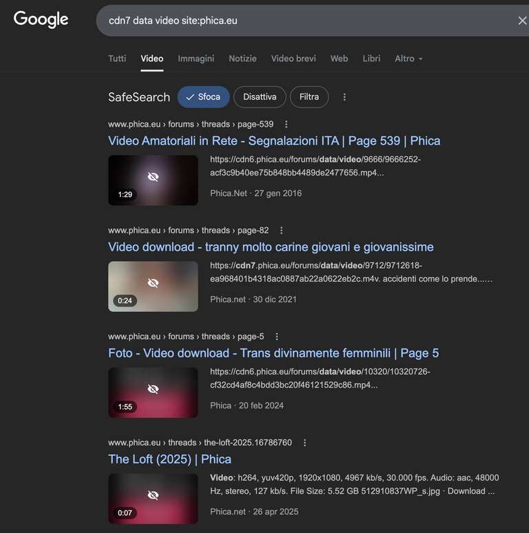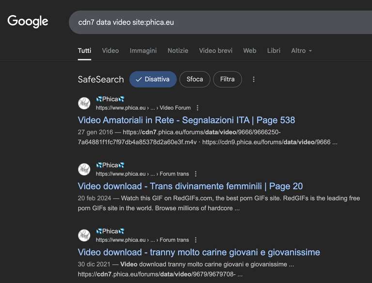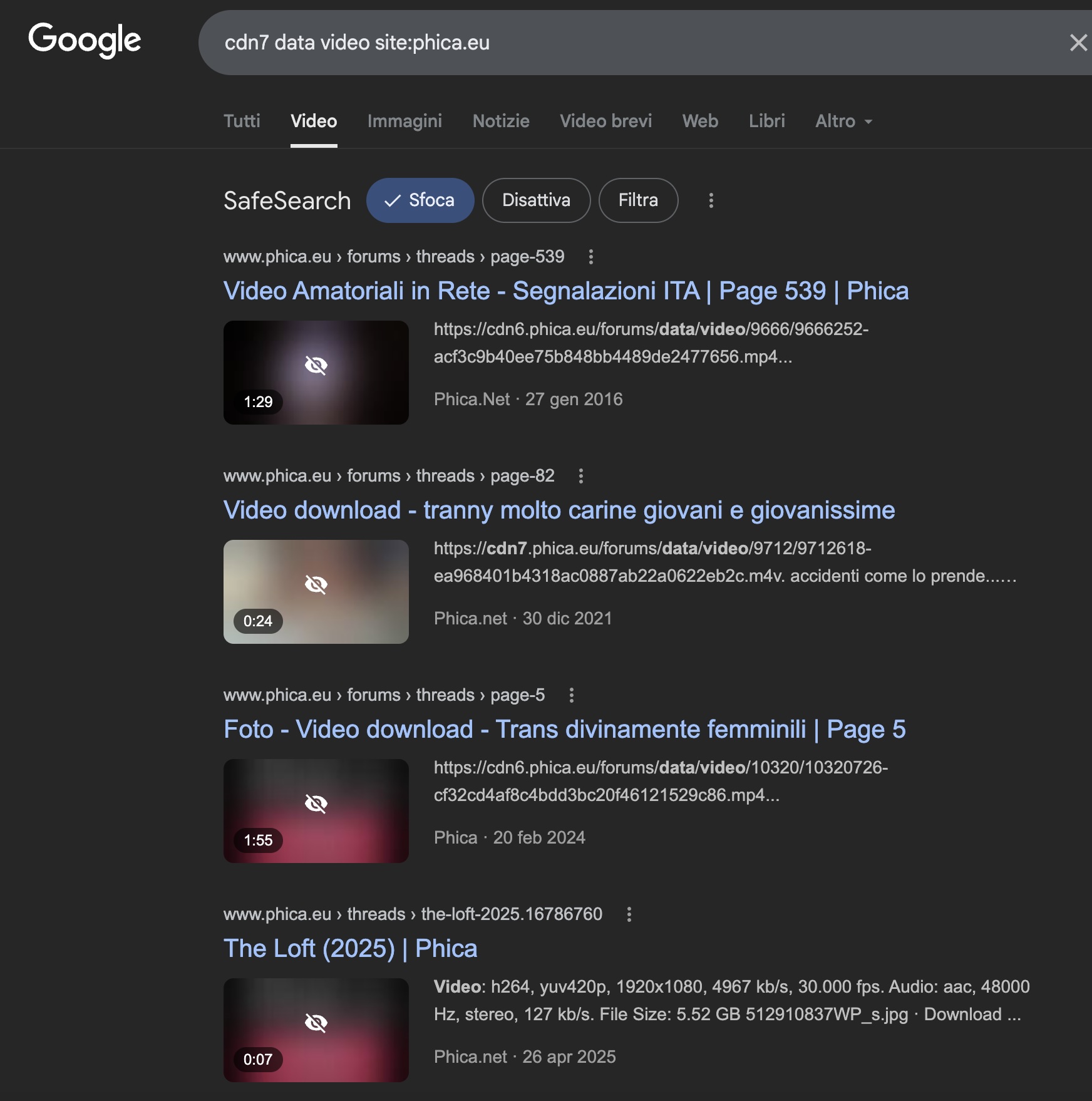 4) phica è anche indicizzata da Google. Non si sono nemmeno sognati di gestire la cosa con un robot.txt, quindi i contenuti sono tutti li, visualizzabili con banali ricerche: cdn6 data video site:phica.eu (oppure cercando cdn5, cdn7, etc...). Contengono dati personali