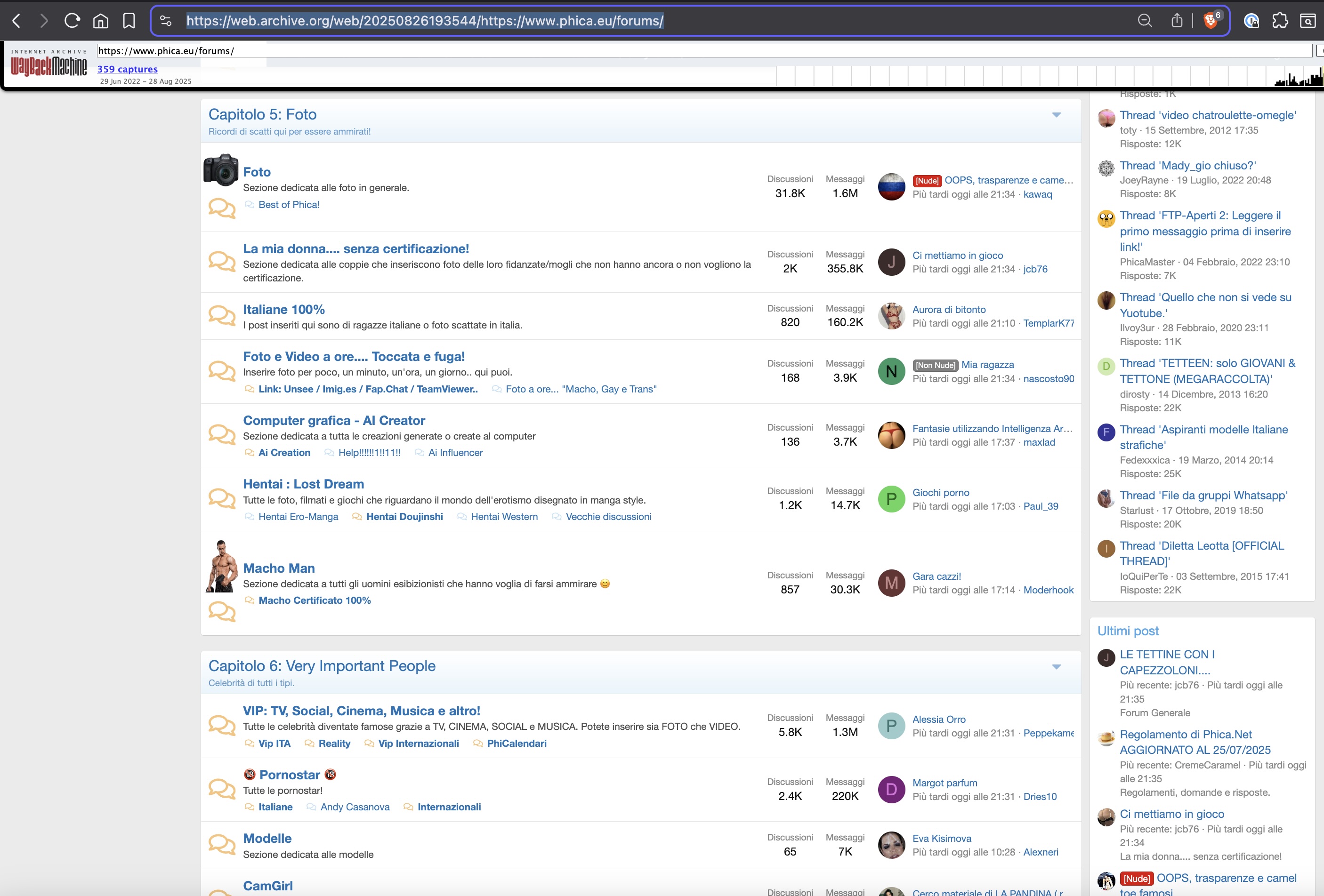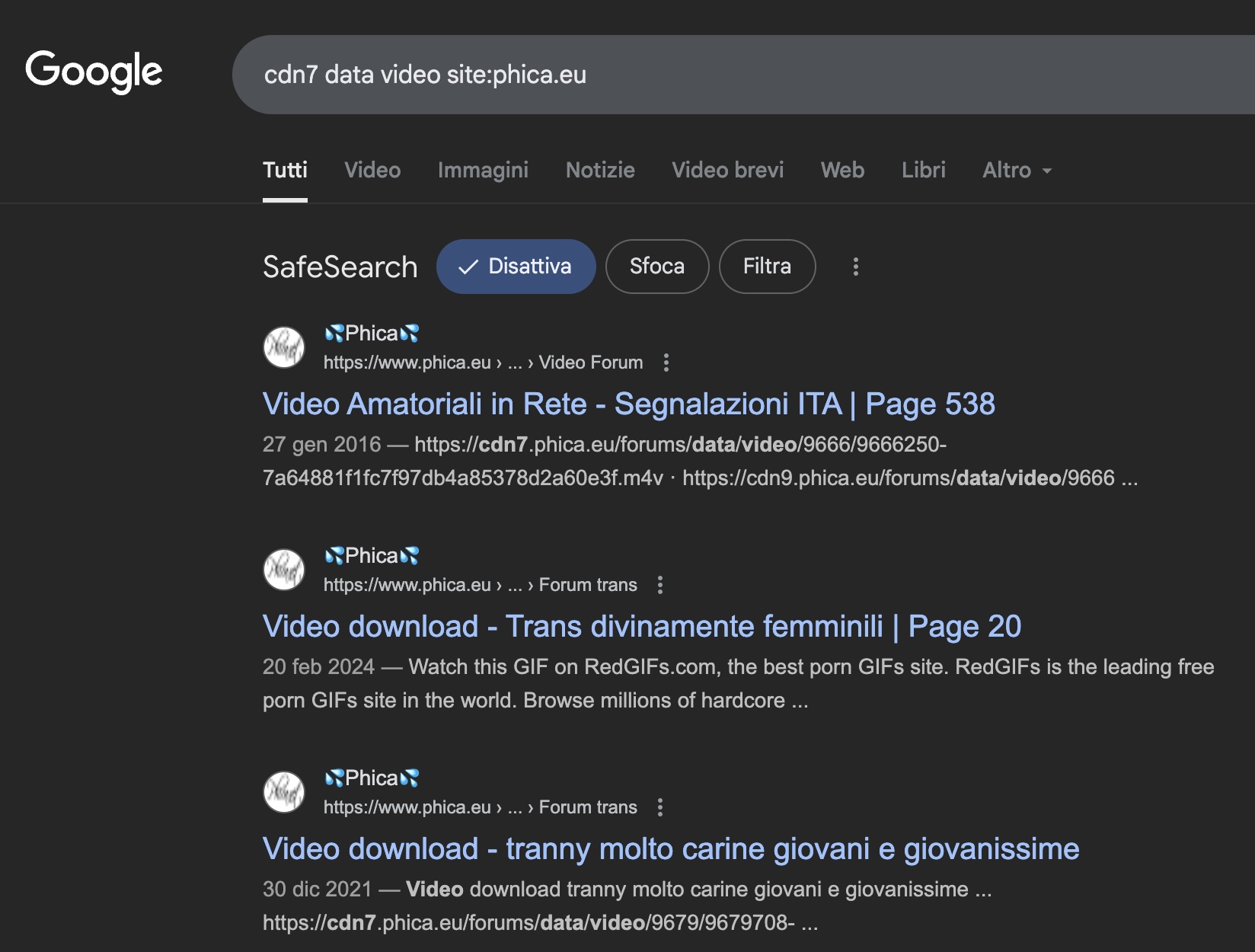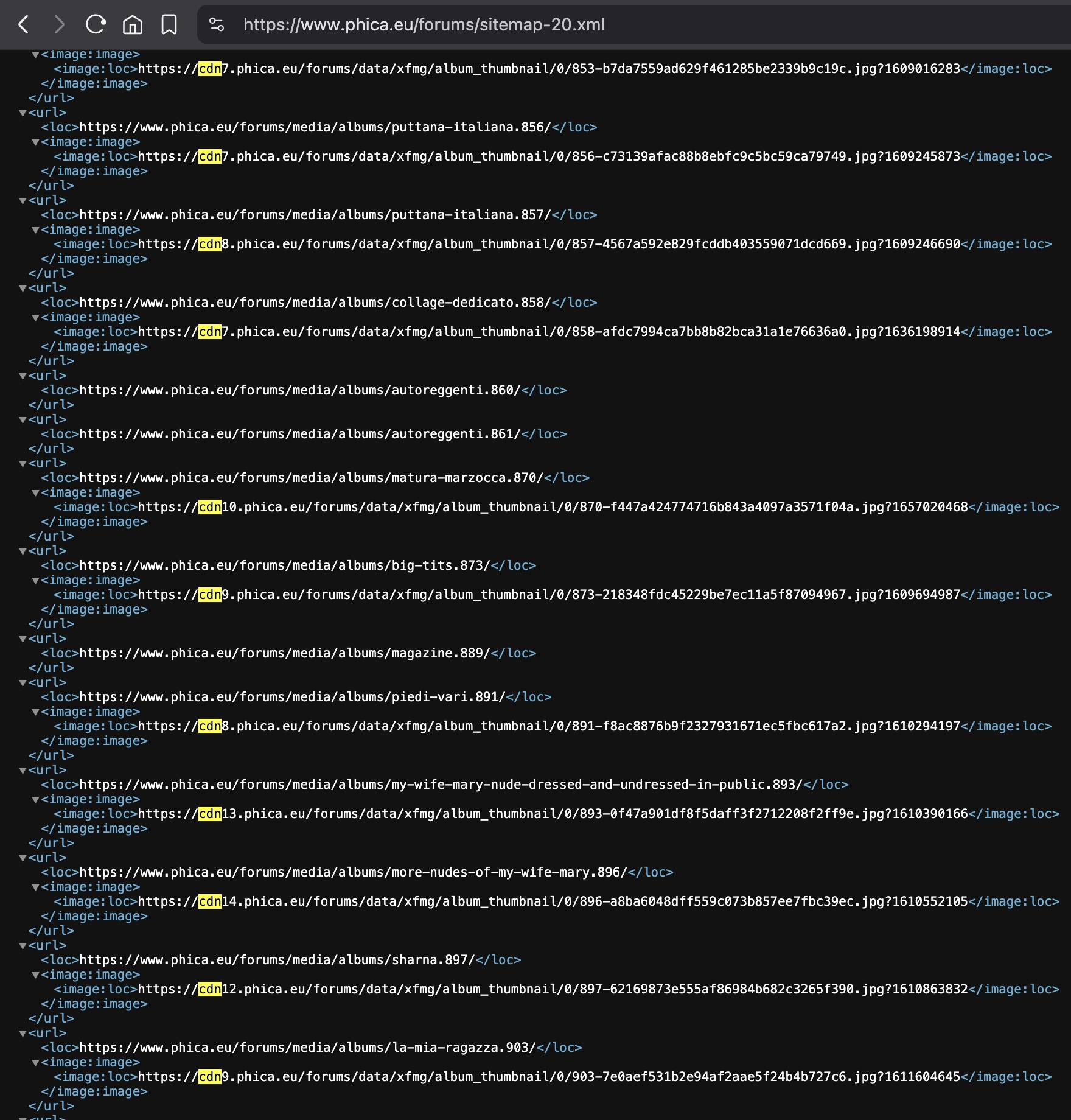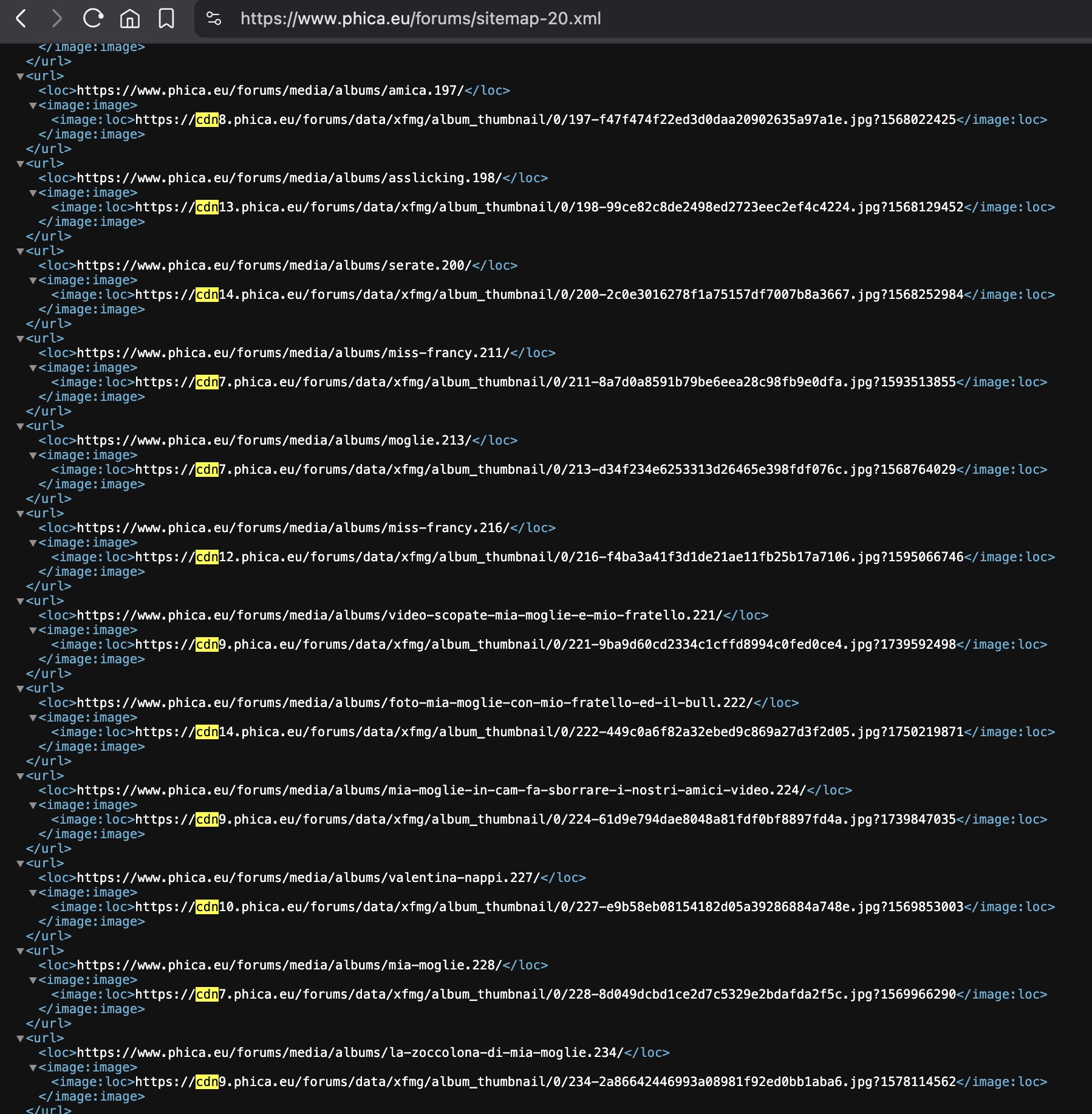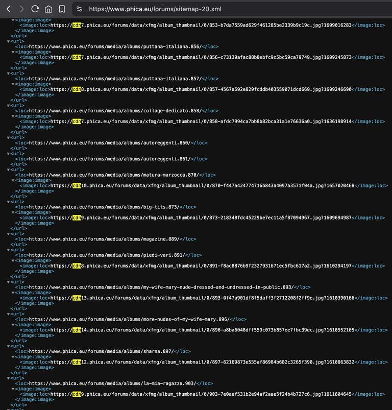 2) dal sito phica sono stati rimossi alcuni contenuti ma non tutti. Le copertine degli album sono ancora accessibili poiché sono salvati su cdn differenti. Contengono dati personali. Per esempio, in https://www.phica.eu/forums/sitemap-20.xml sono linkati circa 2500 immagini esplicite. SOno quelle che iniziano con https://cdn