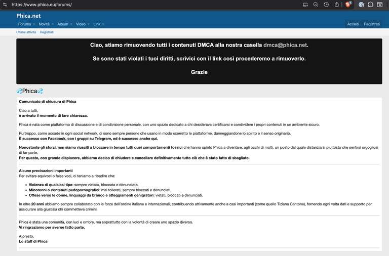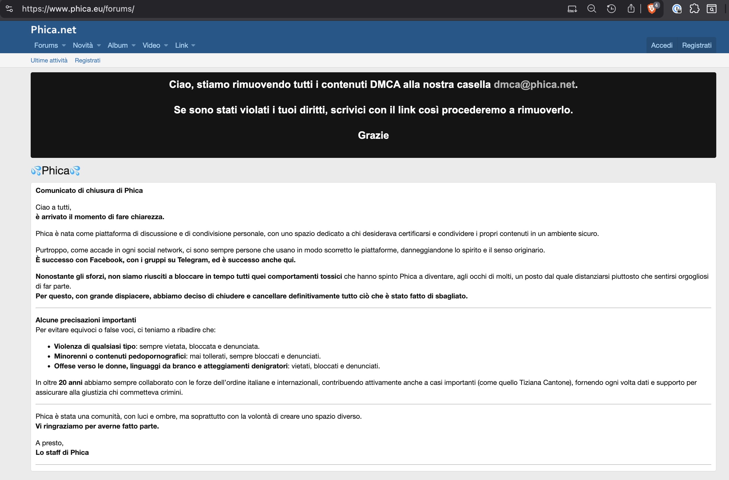il sito "Phica.eu" ha chiuso! Quanto meno questo è ciò che i gestori vorrebbero far credere... o che magari essi stessi credono di aver fatto.