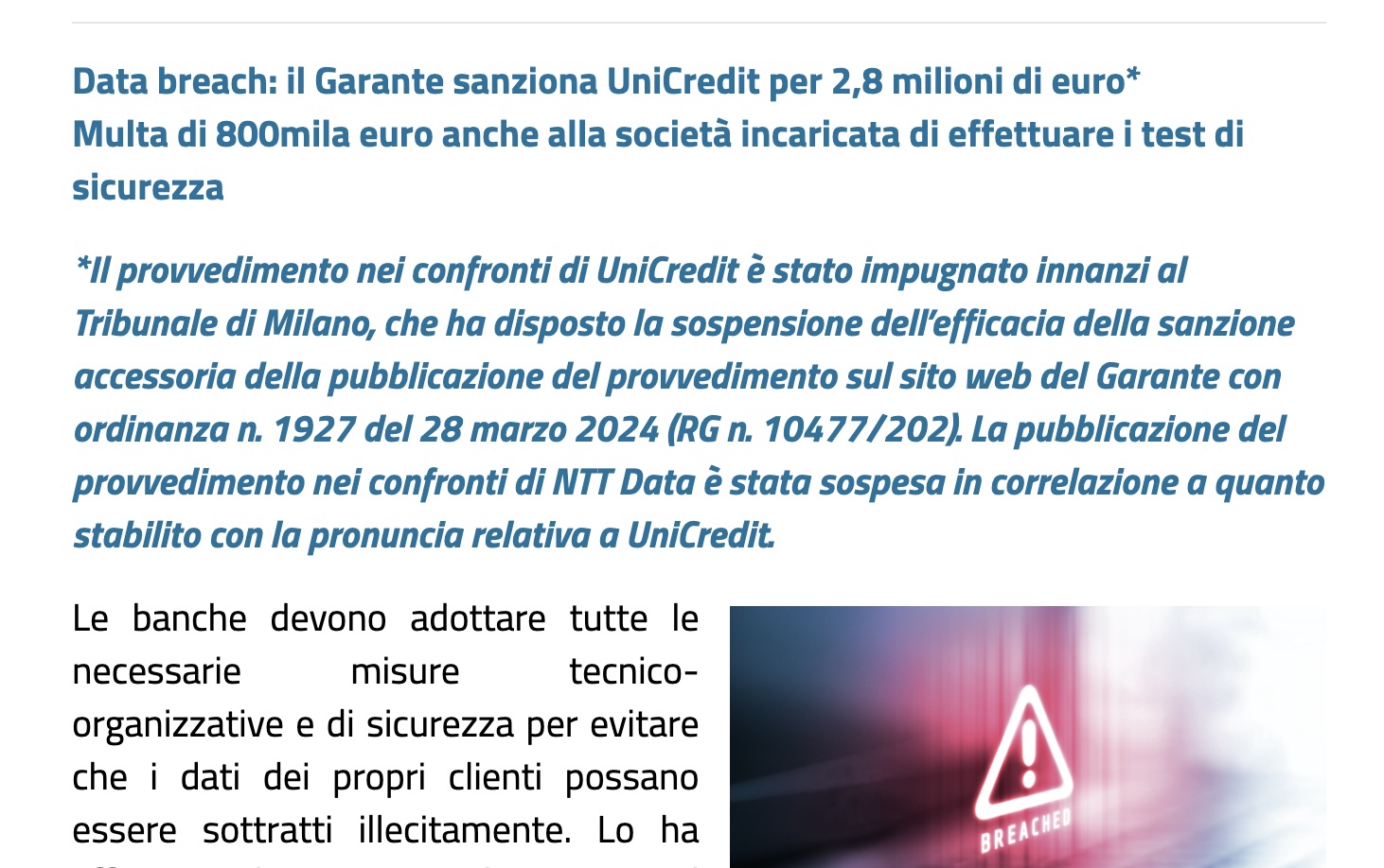 *Il provvedimento nei confronti di UniCredit è stato impugnato innanzi al Tribunale di Milano, che ha disposto la sospensione dell’efficacia della sanzione accessoria della pubblicazione del provvedimento sul sito web del Garante con ordinanza n. 1927 del 28 marzo 2024 (RG n. 10477/202). La pubblicazione del provvedimento nei confronti di NTT Data è stata sospesa in correlazione a quanto stabilito con la pronuncia relativa a UniCredit."