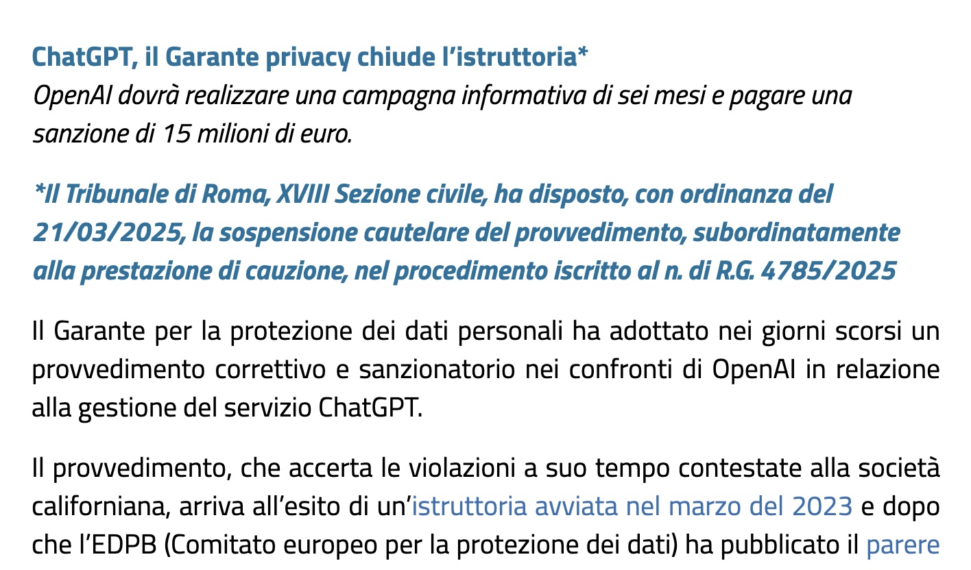 OpenAI dovrà realizzare una campagna informativa di sei mesi e pagare una sanzione di 15 milioni di euro.